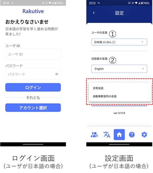 Rakutiveでは、任意の言語設定が可能です。ユーザの母国語の設定①と、利用する在住国(もしくは対話の相手)の言語②を設定することができます。